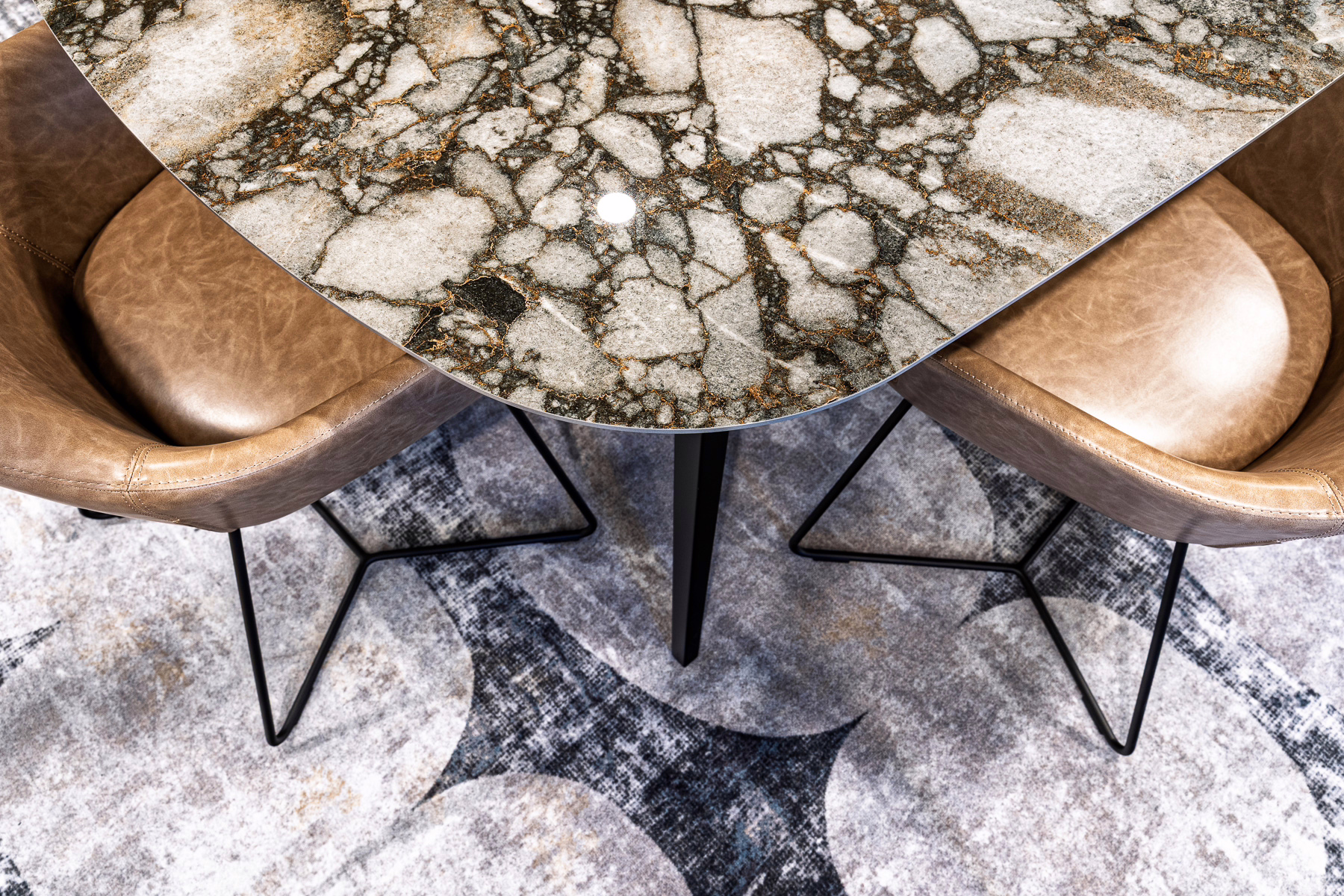 In de vergaderruimte hebben we gekozen voor een mooi maatwerk kleed van Desso Ex&Nature. Deze collectie vindt zijn inspiratie in de natuur. Structuren van natuursteen, travertin, stucco en linnen vormen de basis van de dessins.  De vormgeving van keien sluit fantastisch aan bij de identiteit van Henken.