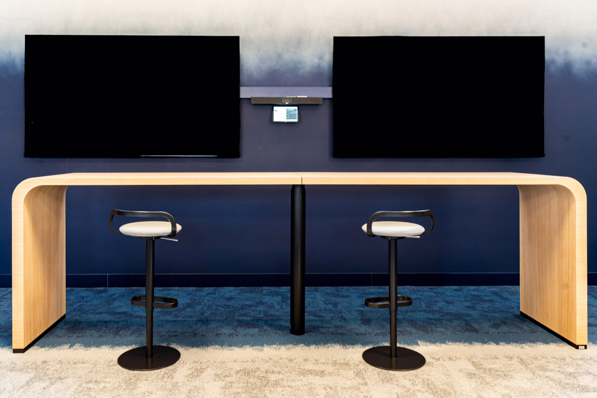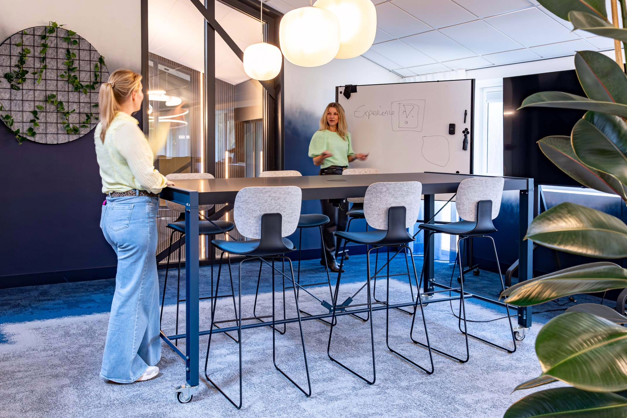 Aan de hoge statafel is ruimte voor klein overleg of presentaties. Dankzij het verrijdbare meubilair kan de ruimte eenvoudig worden aangepast. In het midden creëert de ronde zithoek een vriendelijke, intieme sfeer, terwijl er door het slimme ontwerp toch veel mensen terechtkunnen. De verstelbare tafels maken de plek geschikt voor een kop koffie of werken met een laptop. Achterin is plek voor trainingen: de flexibele tafels en stoelen zorgen dat de indeling snel aan te passen is aan elke situatie.
