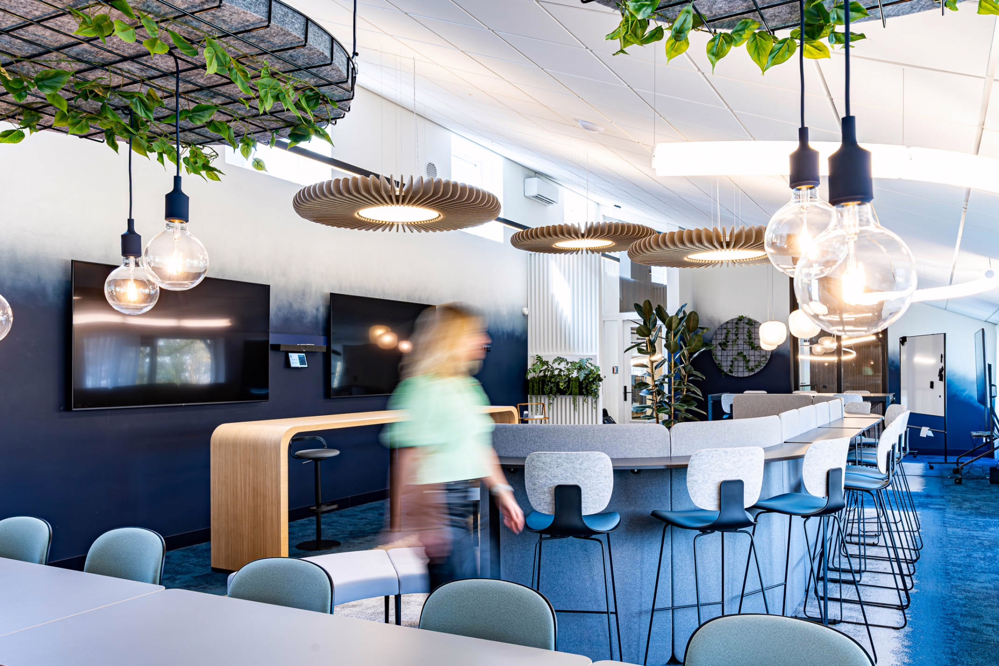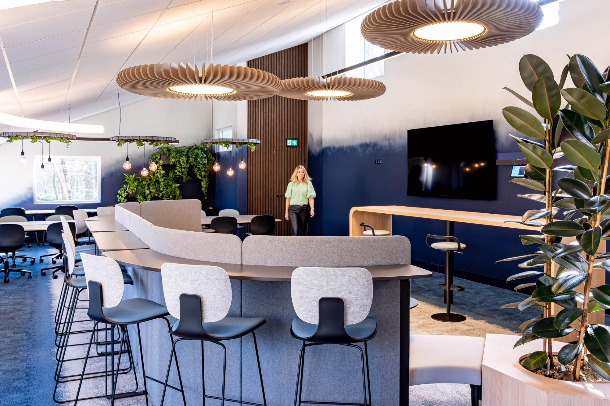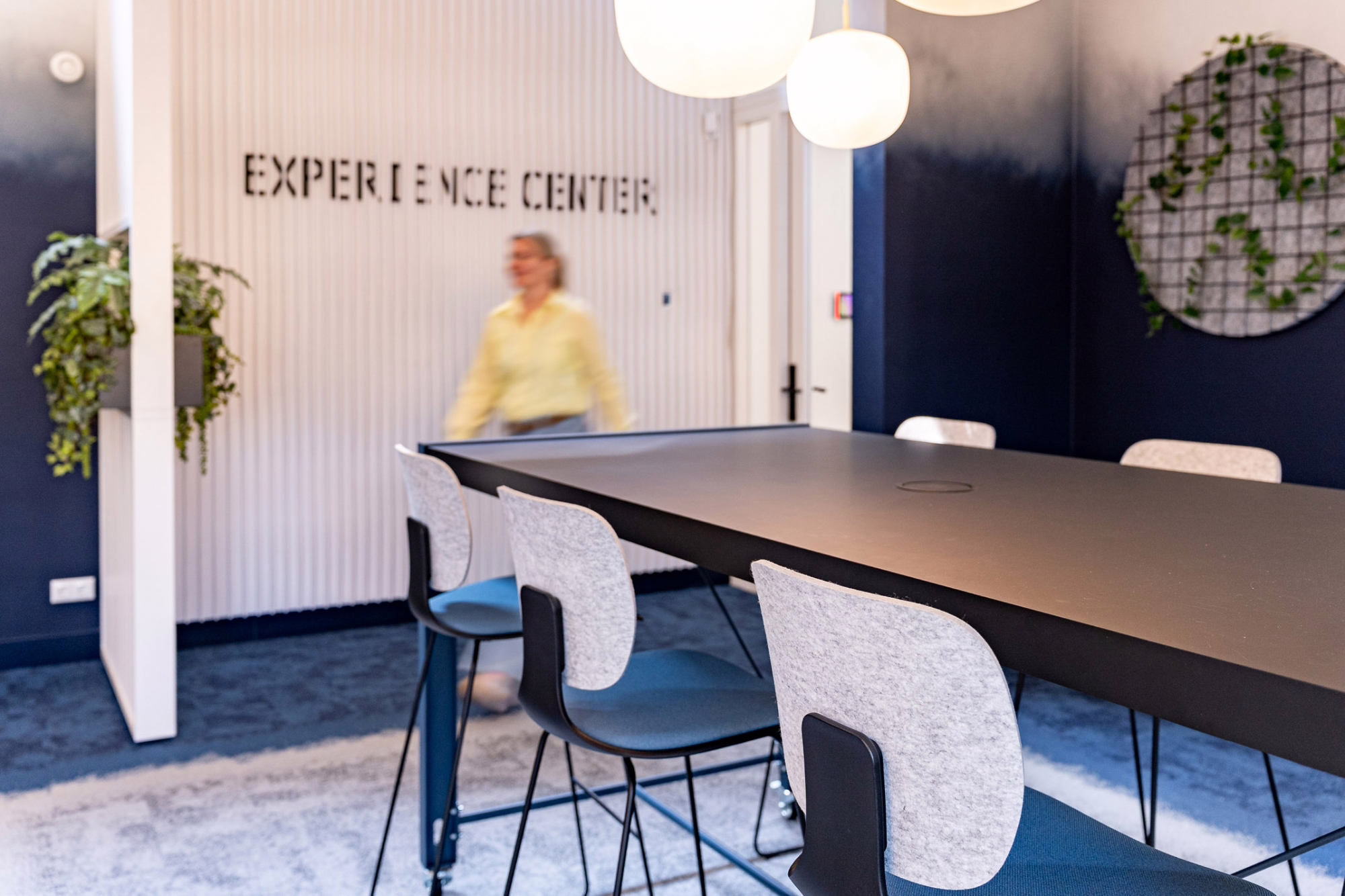 Een echte eyecatcher in het Experience Center zijn de grote akoestische lampen Sol van Flexxica. Met hun royale lichtopbrengst zorgen ze voor perfect werklicht, terwijl het akoestische materiaal bijdraagt aan een prettige geluidsbalans. Maar bovenal trekken ze direct de aandacht – echte sfeermakers die de ruimte karakter geven.