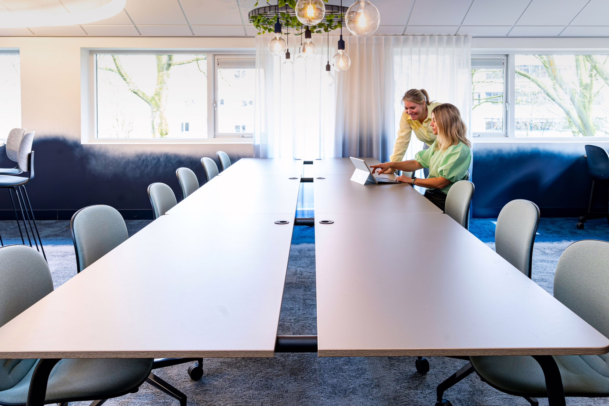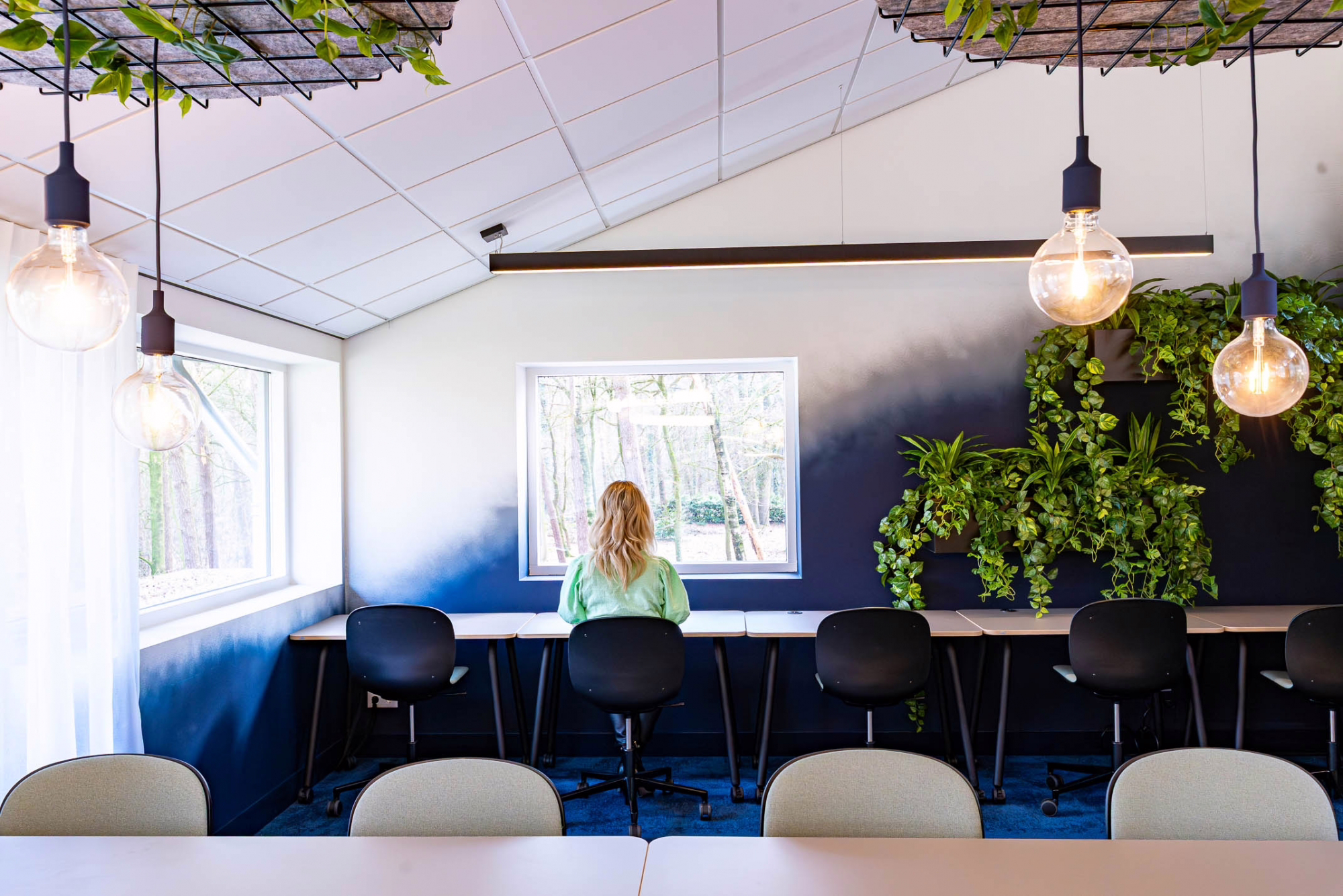 In deze ruimte is veel aandacht besteed aan akoestiek, zodat je ook met meerdere mensen tegelijk prettig kunt werken. De akoestische plafond- en wandelementen en de ronde lampen verbeteren niet alleen het geluid, maar versterken ook de sfeer.