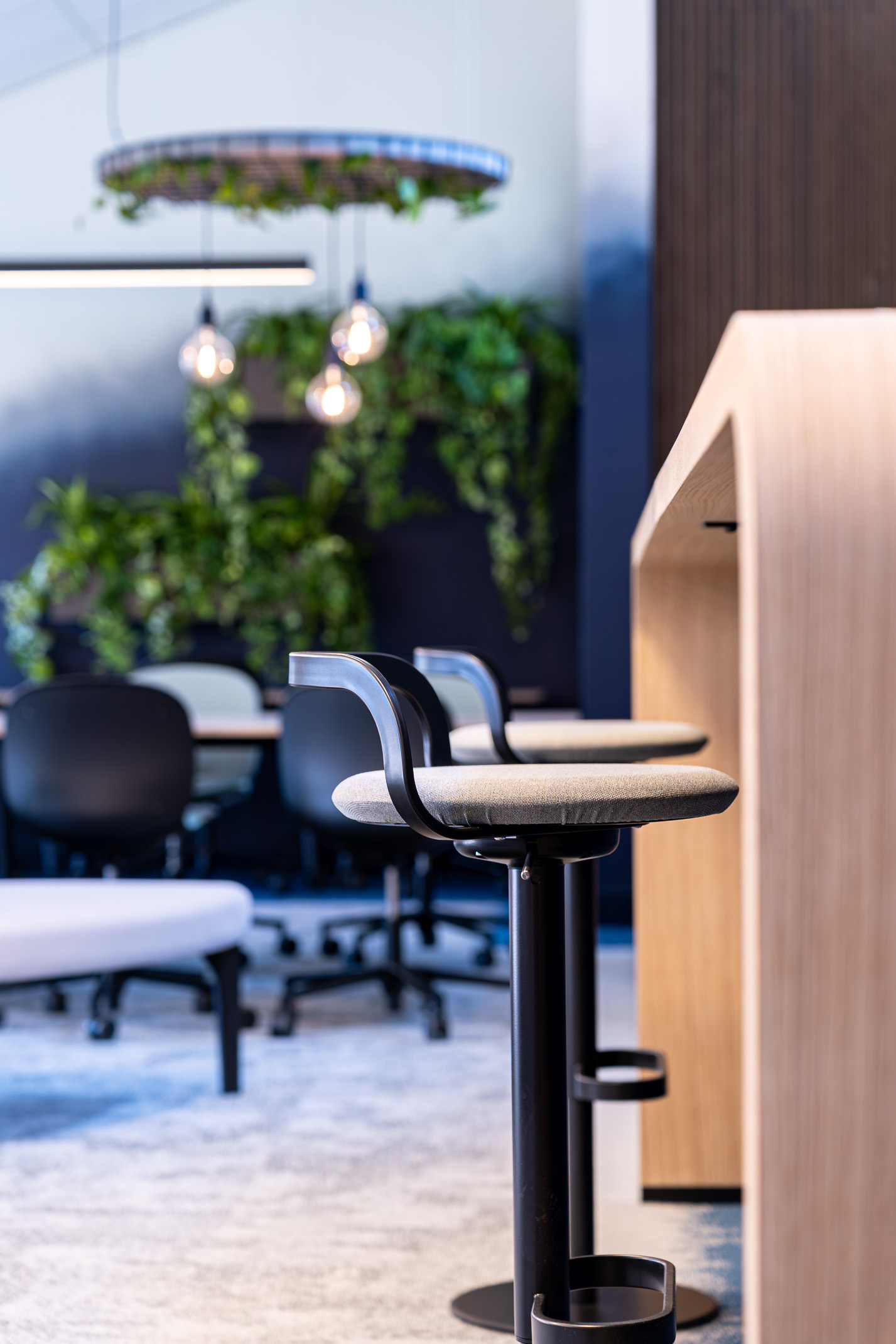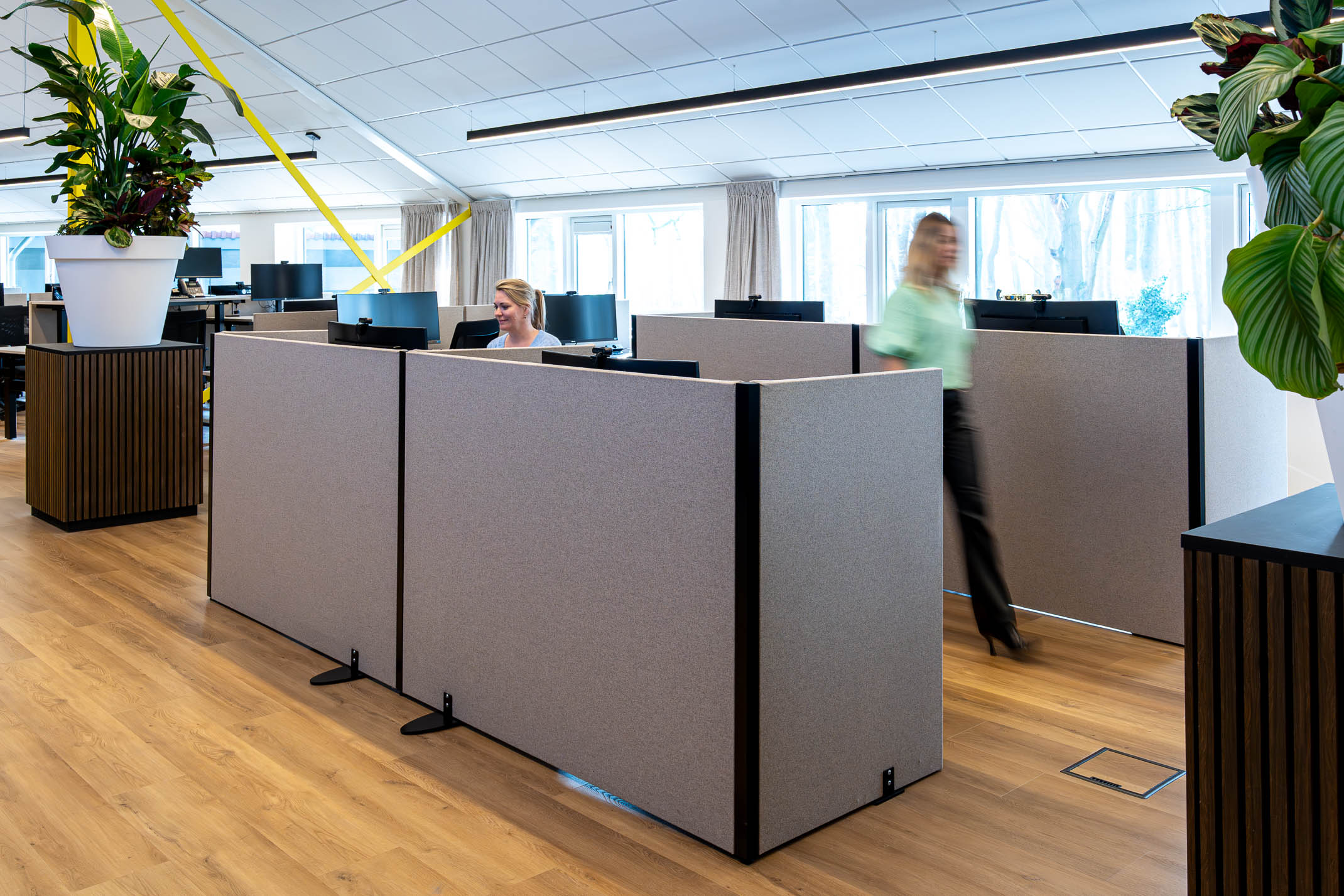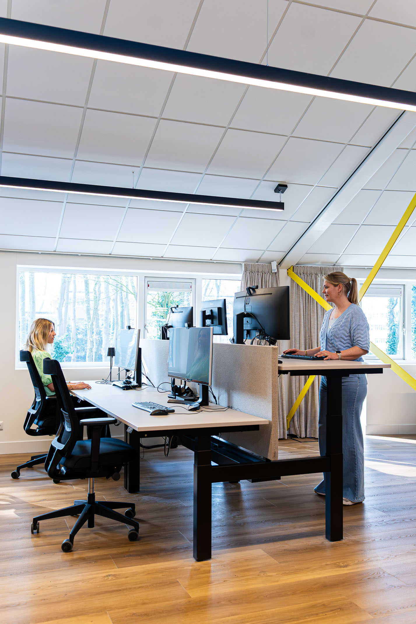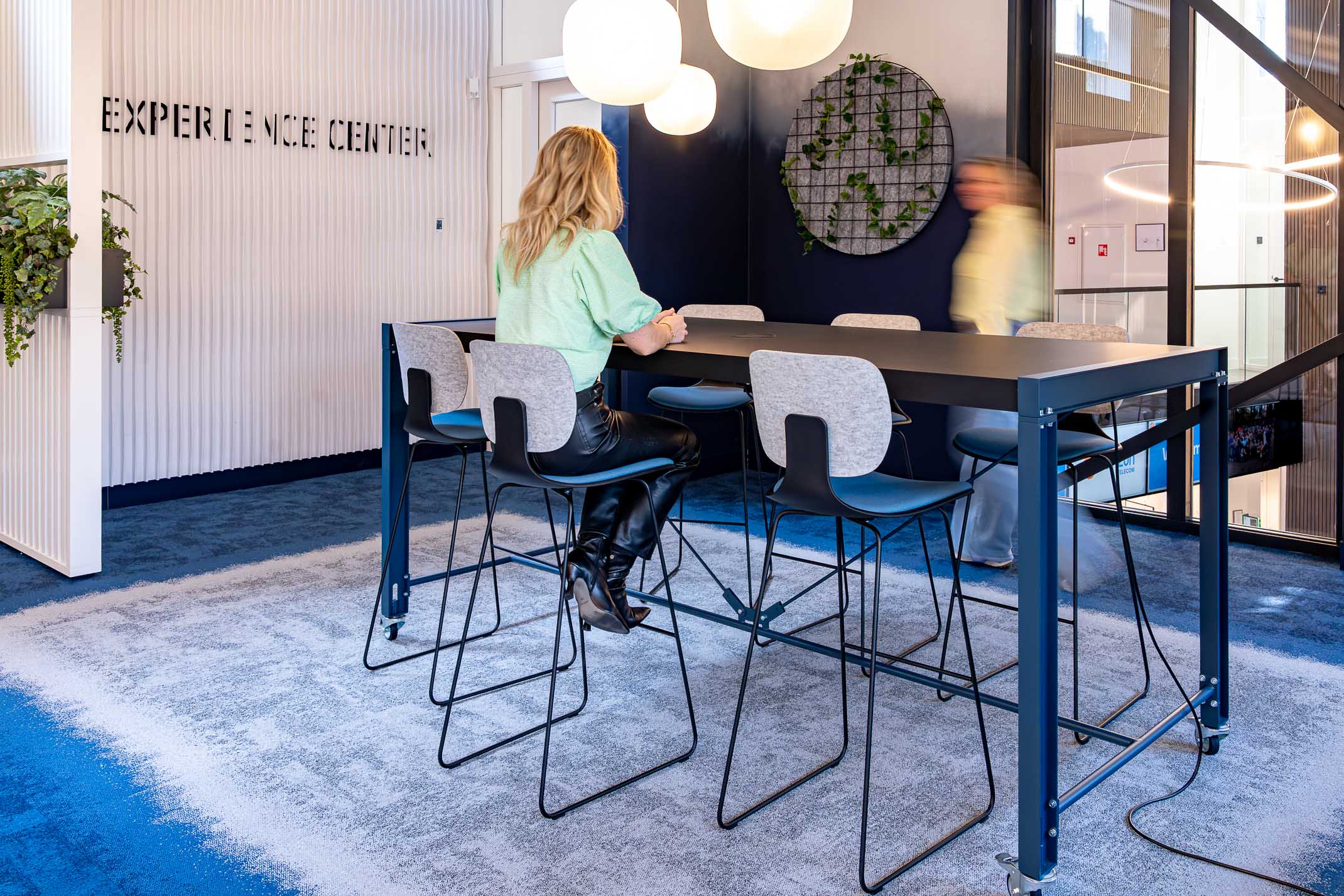 Naast het Experience Center is de kantoortuin ingericht met 56 nieuwe zit-sta werkplekken, voorzien van stijlvolle bureaustoelen en privacypanelen. Zo ontstaat een moderne en comfortabele werkomgeving.