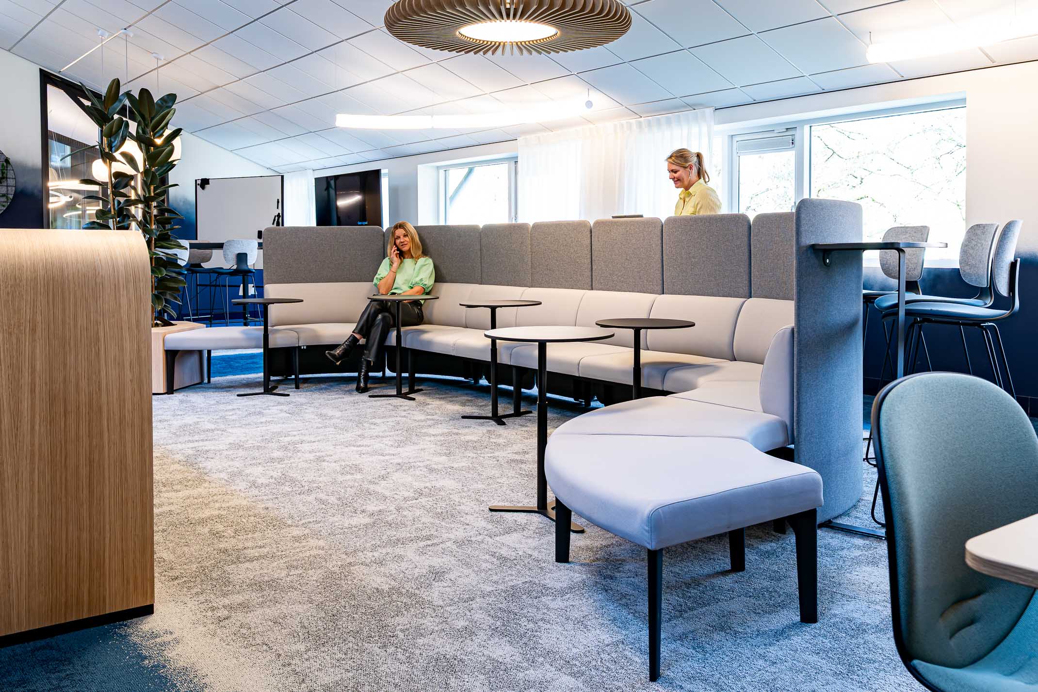 Midden in de ruimte hebben we gekozen voor de modulaire bank van Sedus. Deze bank heeft een uitnodigende vormgeving. De zitplekken aan de achterzijde bieden de mogelijkheid om hoger te zitten, wat zorgt voor extra dynamiek en voldoende zitruimte. Een comfortabele en veelzijdige opstelling die uitnodigt tot ontmoeting en overleg.