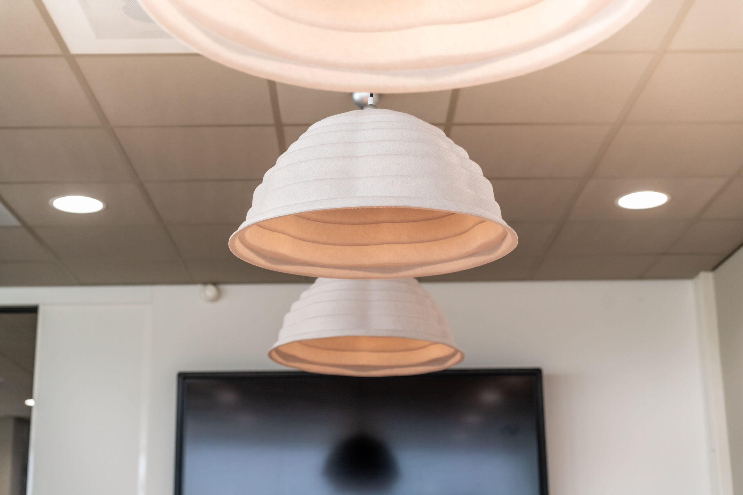 Voor de verlichting is gekozen voor de akoestische lampen van Feltouch. Deze lampen combineren stijlvolle vormgeving met functionele akoestiek, waardoor ze niet alleen sfeer brengen maar ook zorgen voor een prettige geluidsomgeving. Dankzij het gebruik van vilt van gerecyclede PET-flessen zijn ze bovendien een duurzame keuze. Feltouch bewijst dat design, comfort en duurzaamheid perfect samen kunnen gaan.
