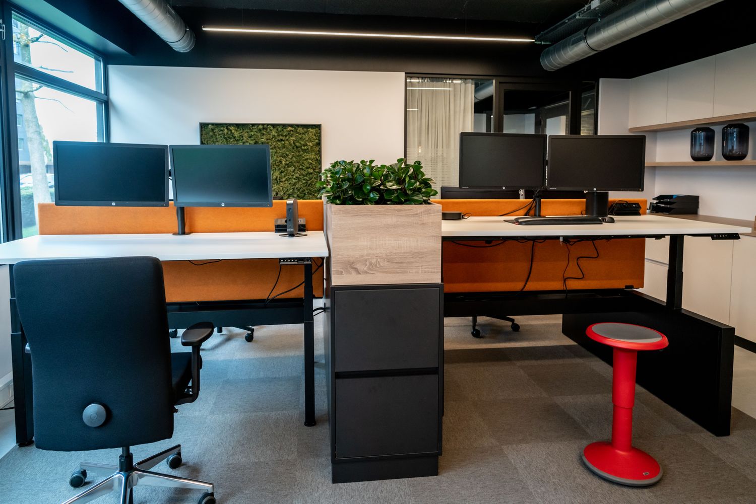 Ergonomische zit-sta werkplekken met akoestische oplossingen en bureaustoelen.