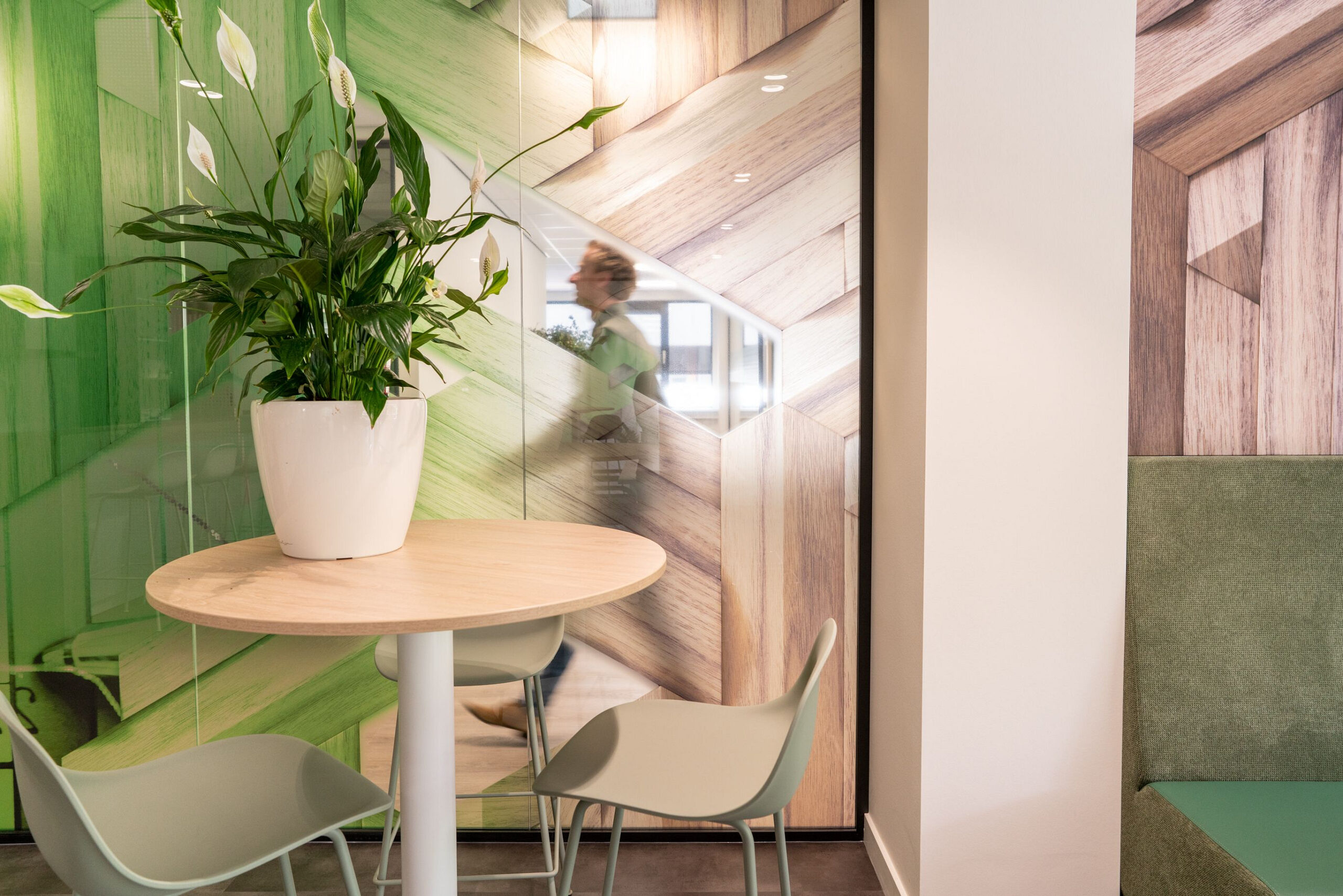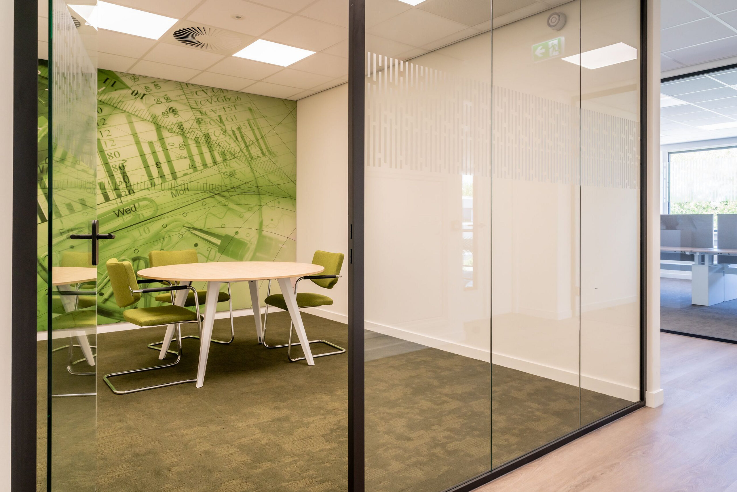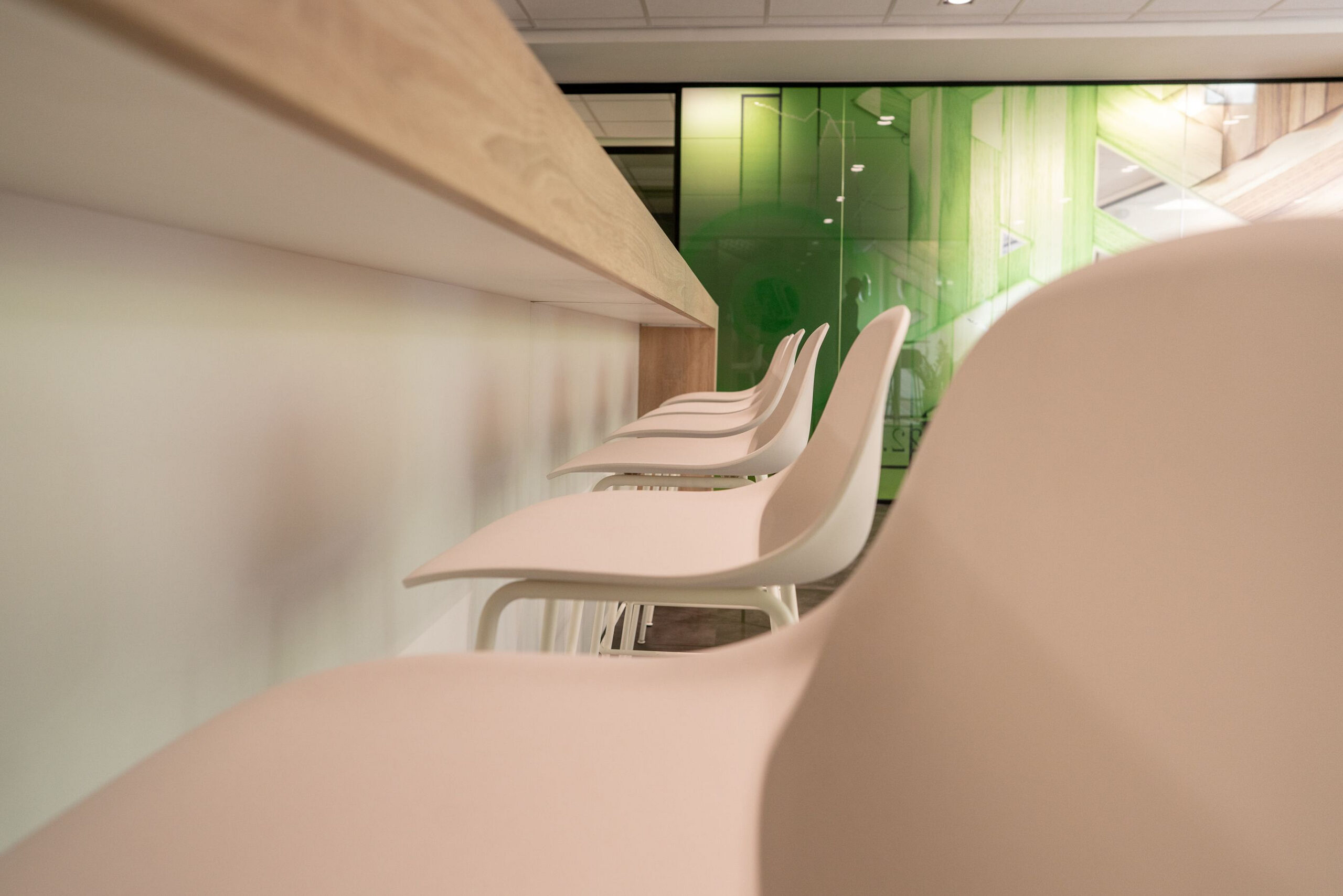 Door de geheel nieuwe entreegevel, in combinatie met de openheid van het vele glas en de open kantoren ademt dit kantoor veel energie en is het er prettig werken met veel aandacht voor groen. De zelfgemaakte visuals qua ontwerp en akoestische frames in de overlegruimten hebben we samen met Simone Huiting van MAVVA gerealiseerd.