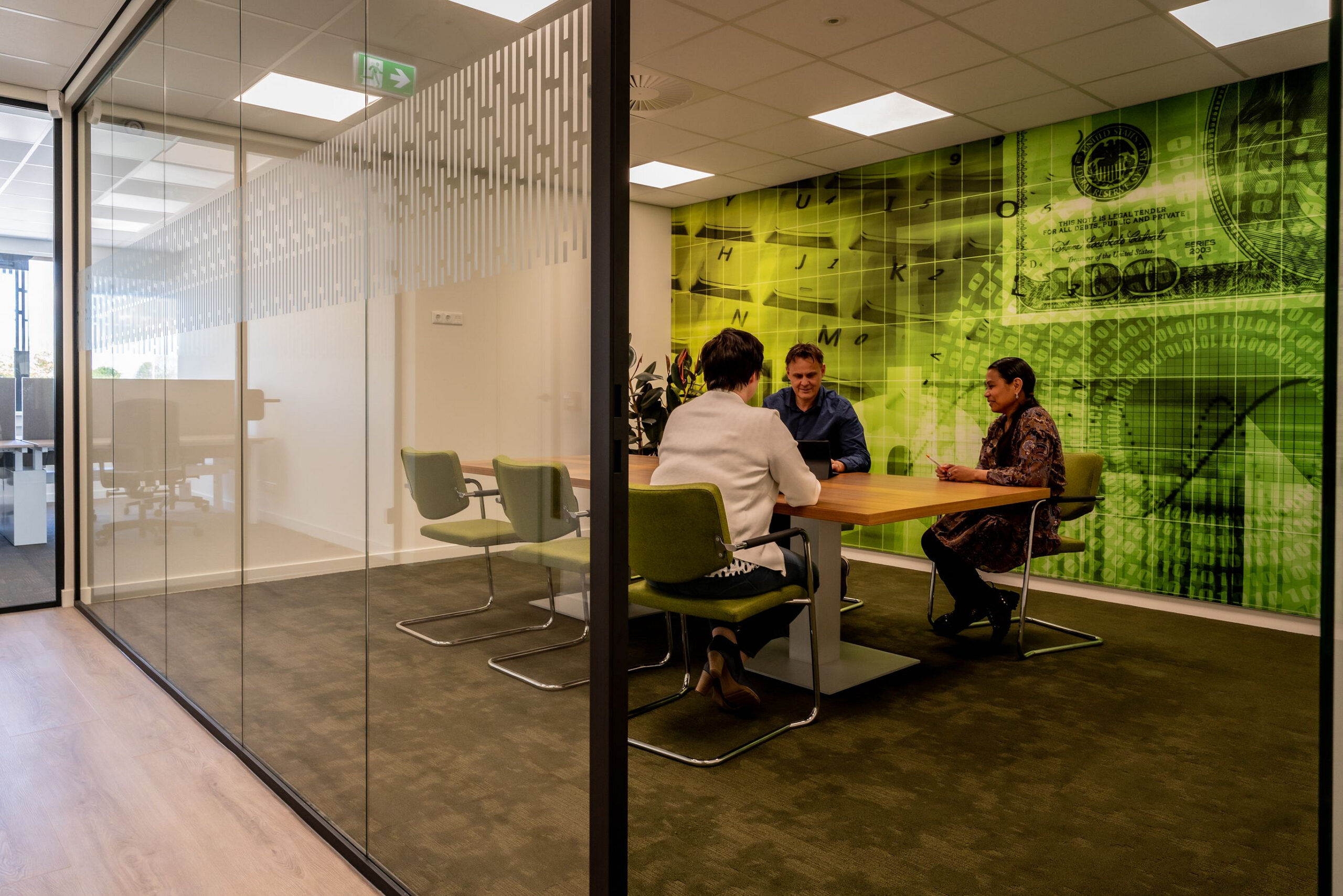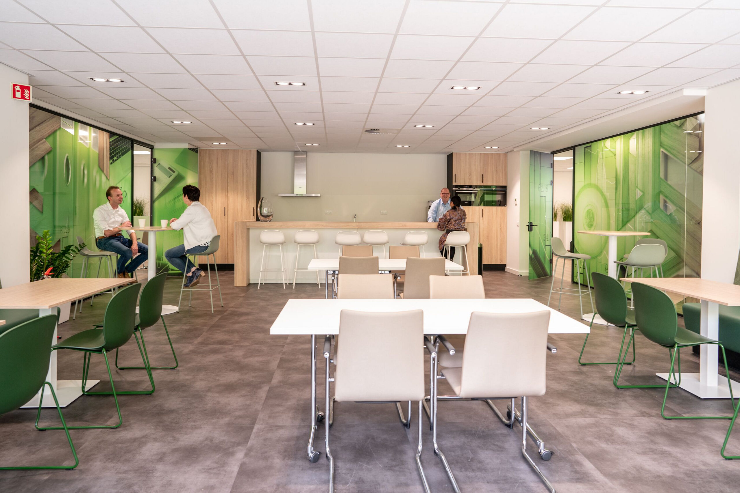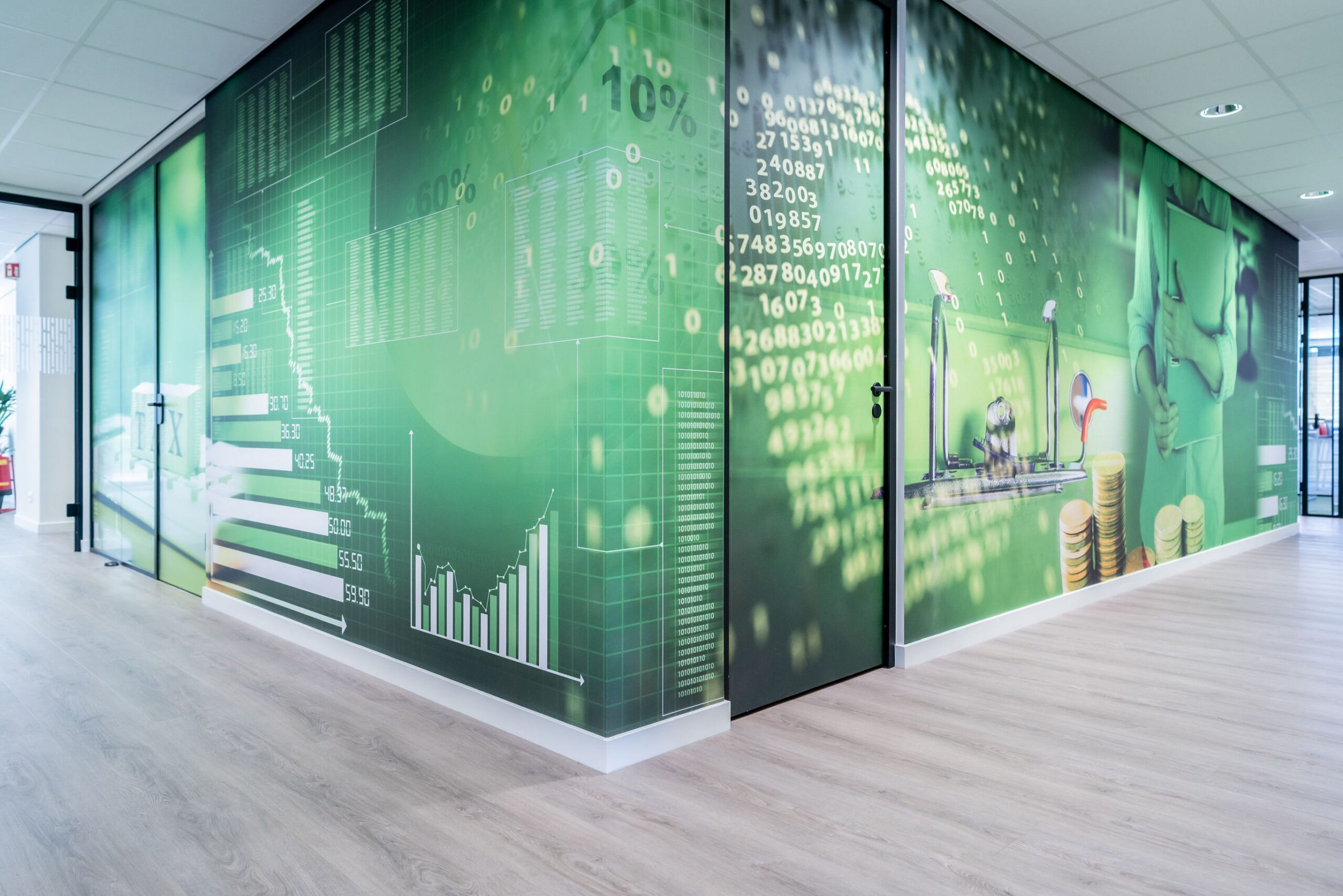 Door de geheel nieuwe entreegevel, in combinatie met de openheid van het vele glas en de open kantoren ademt dit kantoor veel energie en is het er prettig werken met veel aandacht voor groen. De zelfgemaakte visuals qua ontwerp en akoestische frames in de overlegruimten hebben we samen met Simone Huiting van MAVVA gerealiseerd.