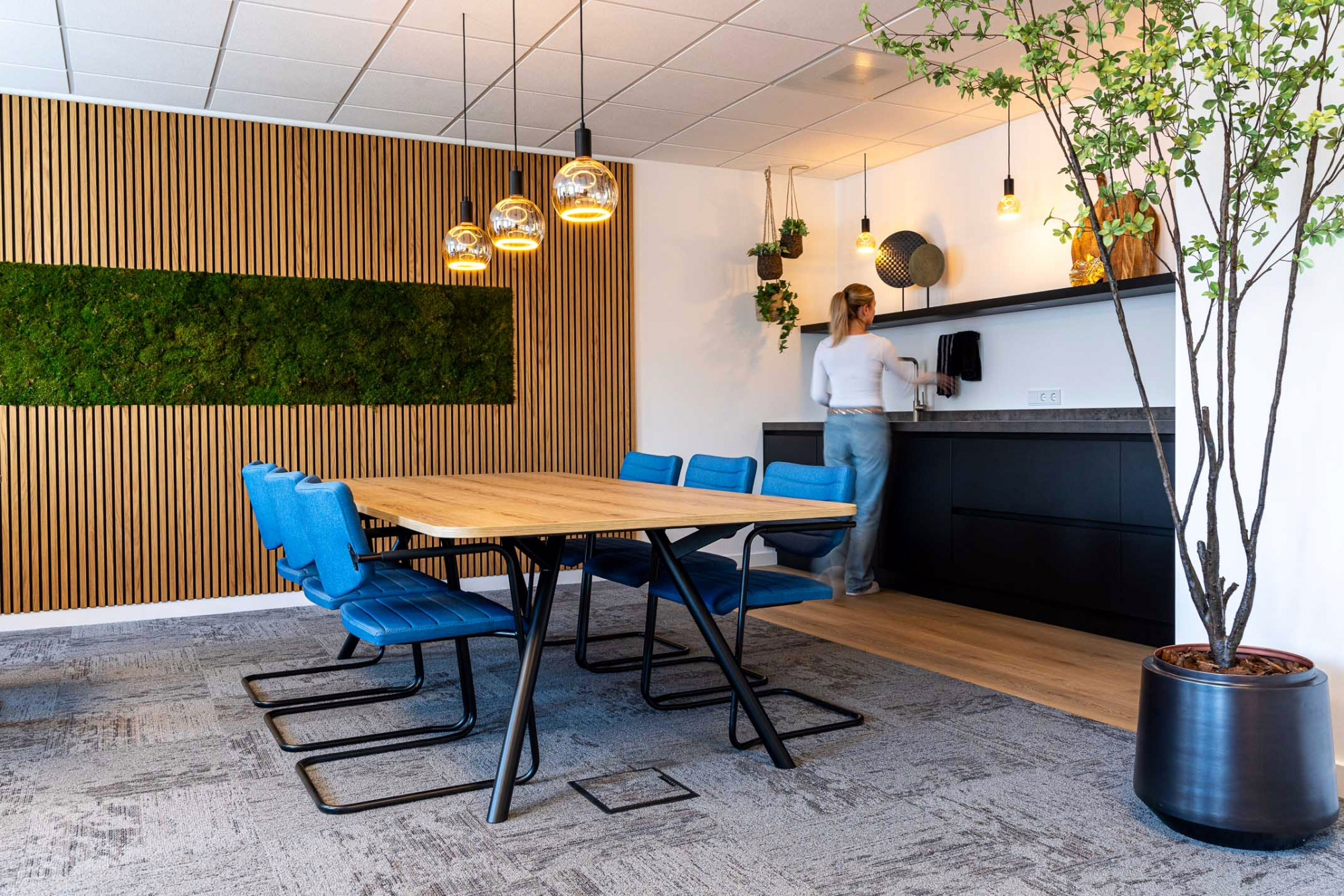 De entree is een echte blikvanger en laat zien wat samenwerking kan opleveren. Dubbel M verzorgde de stijlvolle lattenwanden, Axent Reclame het logo op RVS-plaat en het blauwe stoffen behang,  de Plantentenman.nl de schitterende moswand. Samen vormen ze een inspirerend geheel. Precies zo als wij in het ontwerp bedacht hebben.