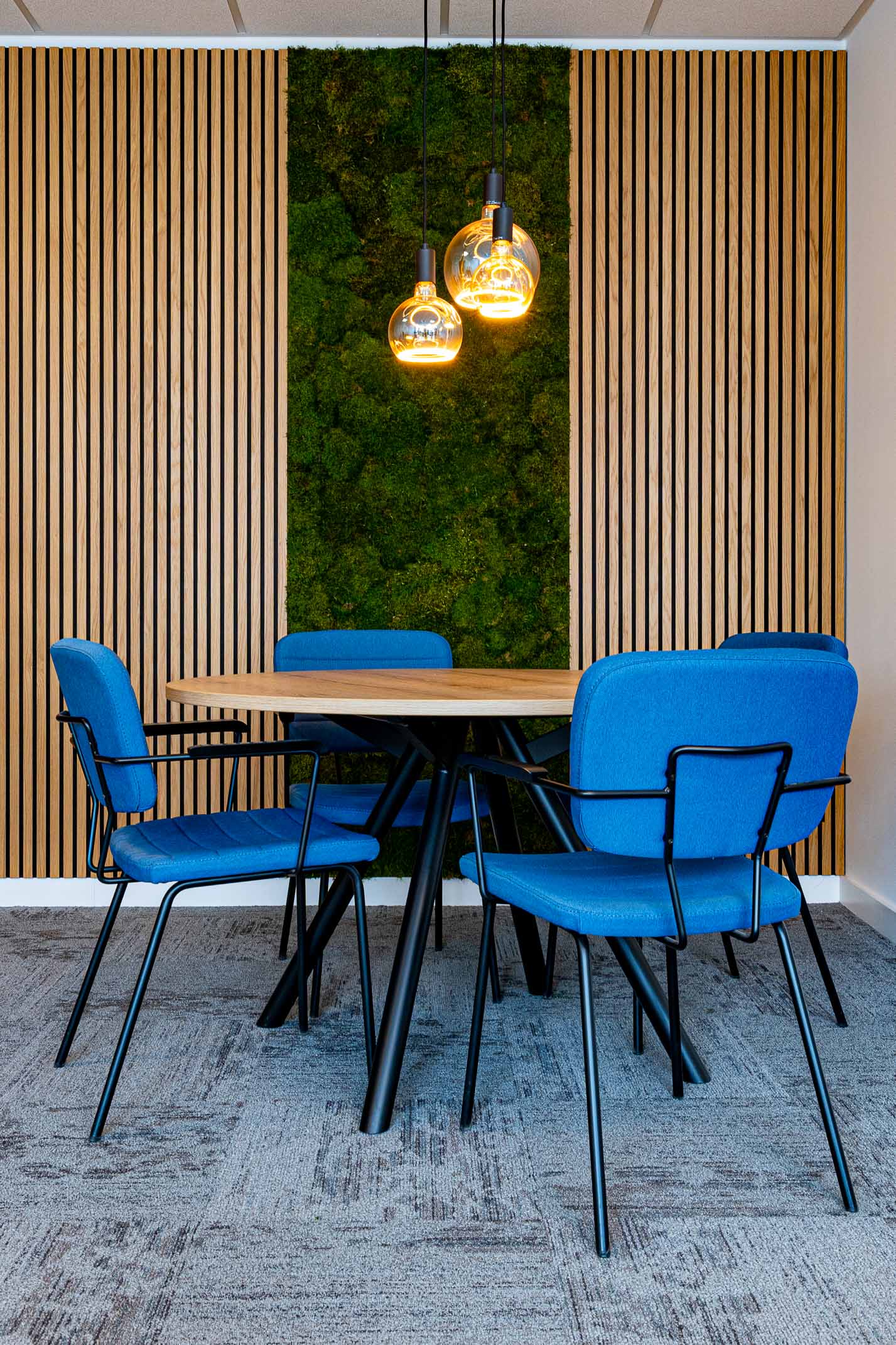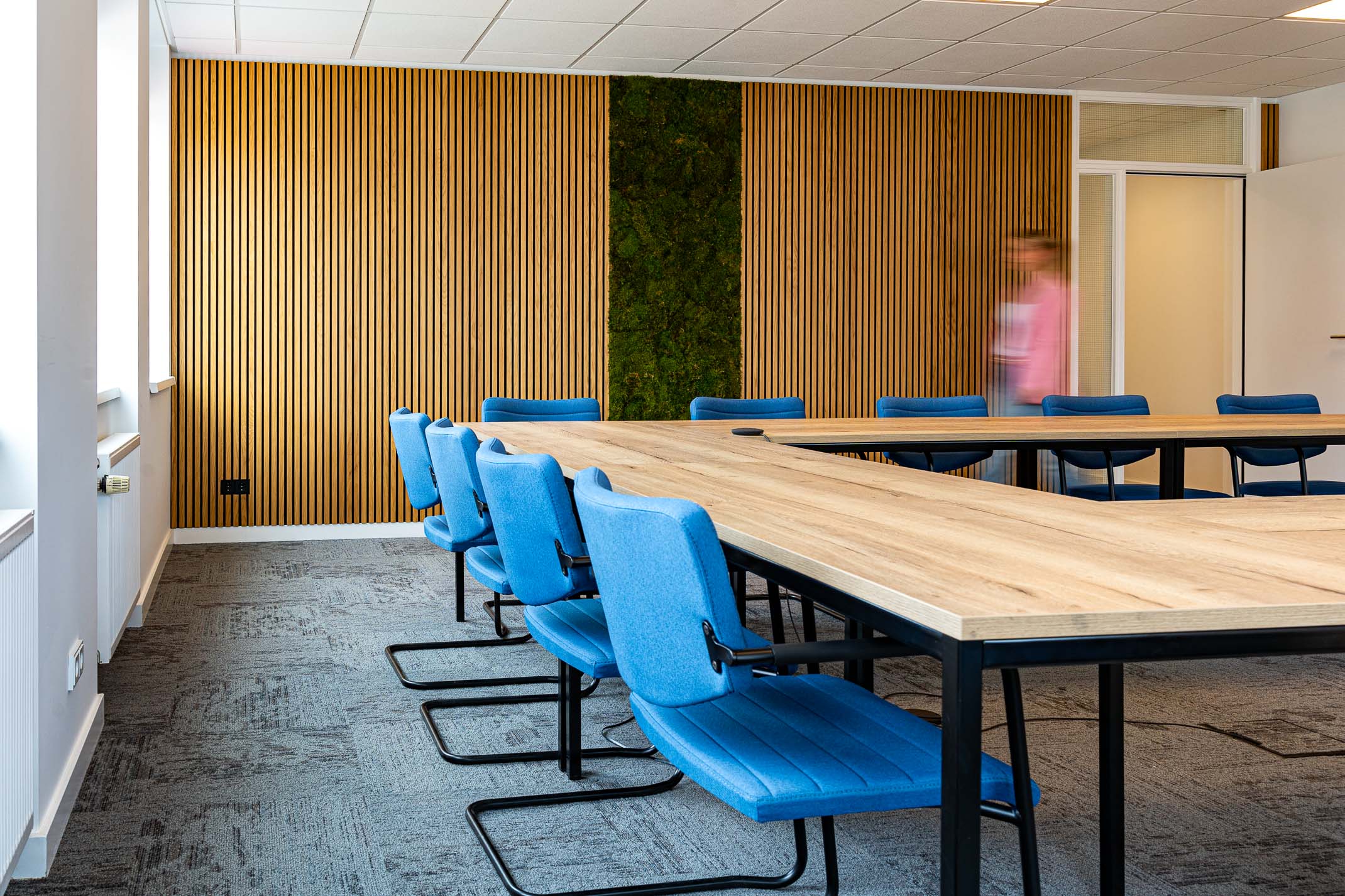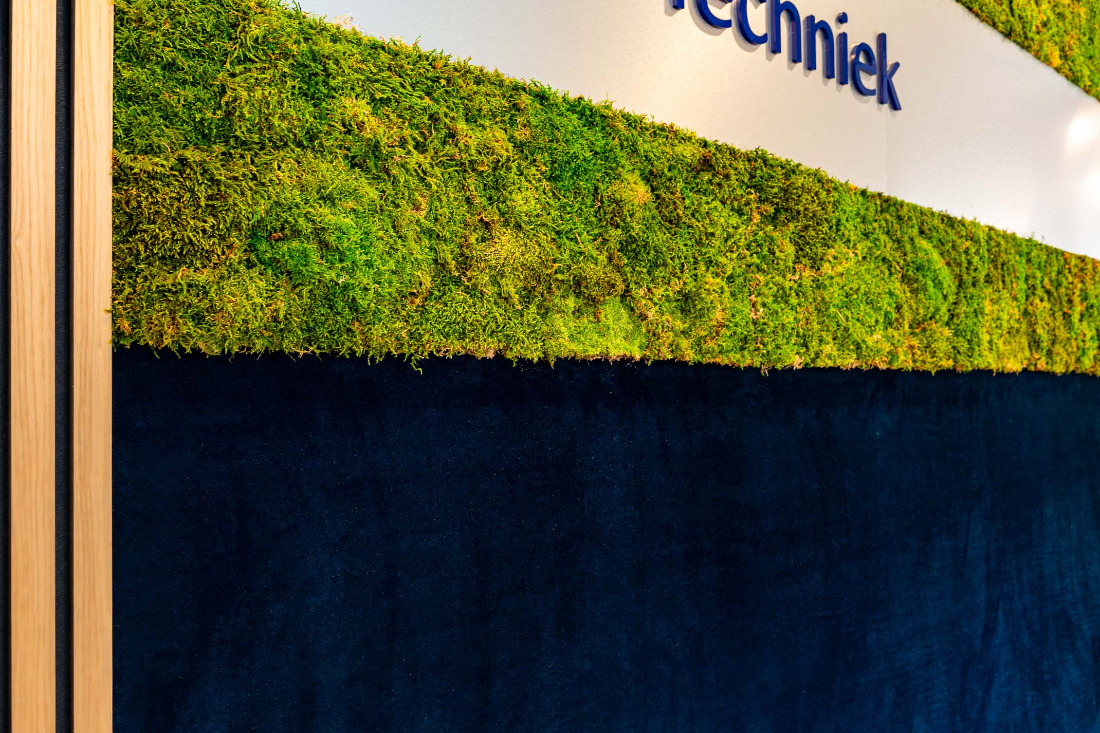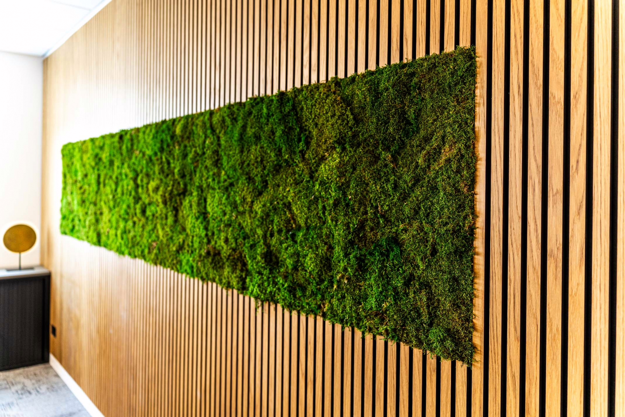 De akoestiek kreeg extra aandacht. Akoestische latten, gecombineerd met stroken van mos, zorgen niet alleen voor een prettige geluidsbeleving, maar ook voor een levendig en natuurlijk effect. De lange wanden en entree vormen samen een harmonieus geheel dat het ontwerp helemaal afmaakt.