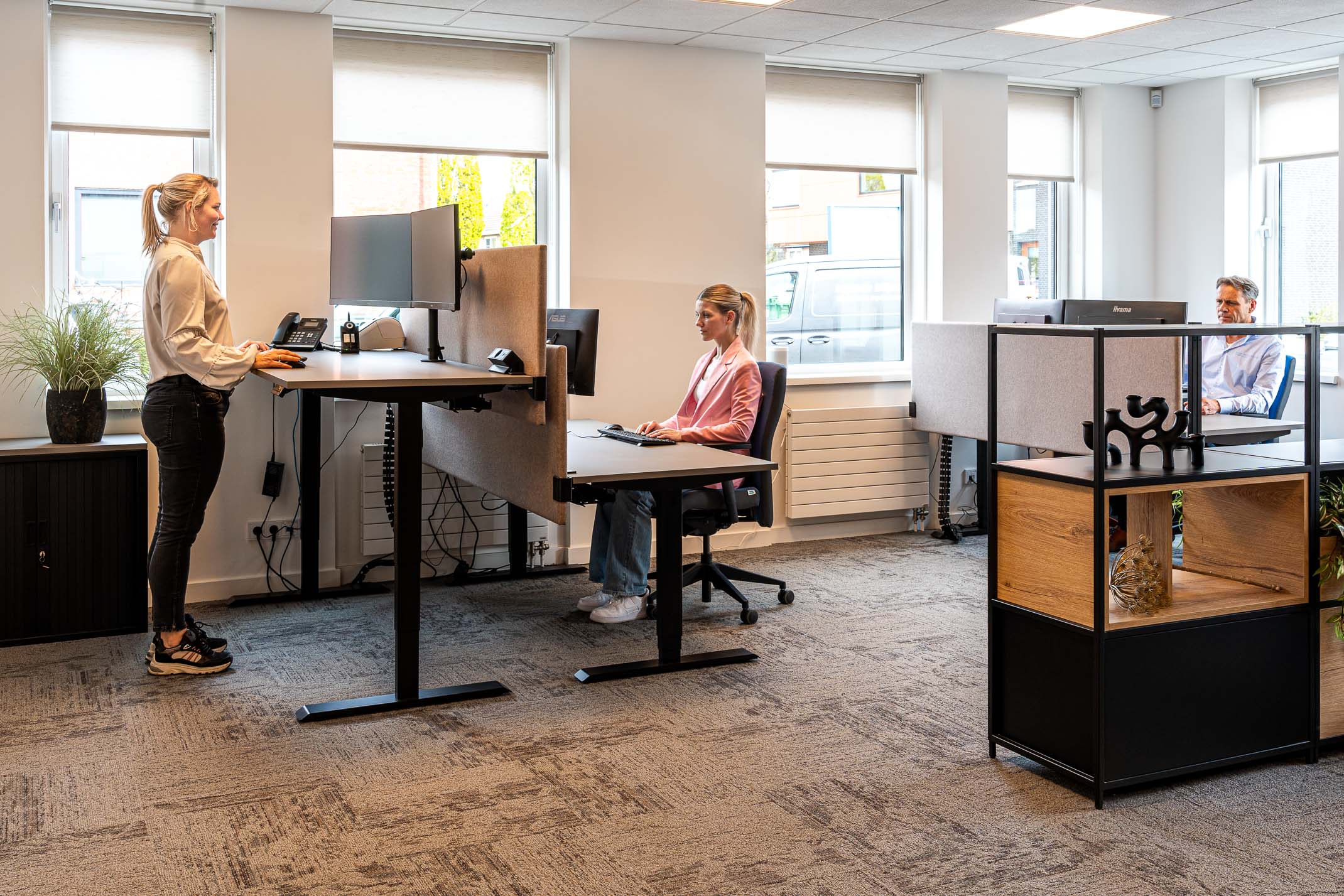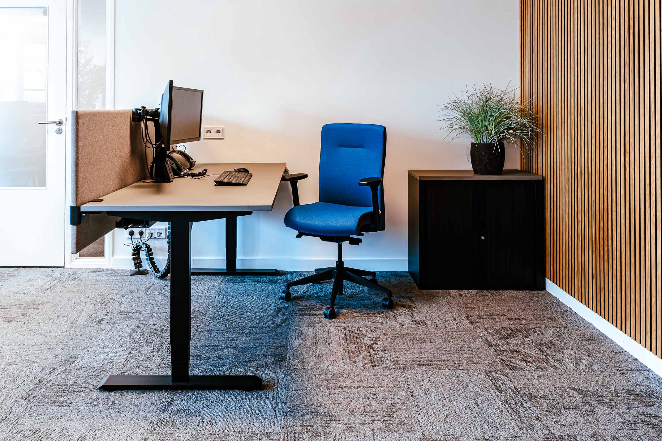 Ergonomische zit-sta werkplekken met akoestische oplossingen en bureaustoelen.