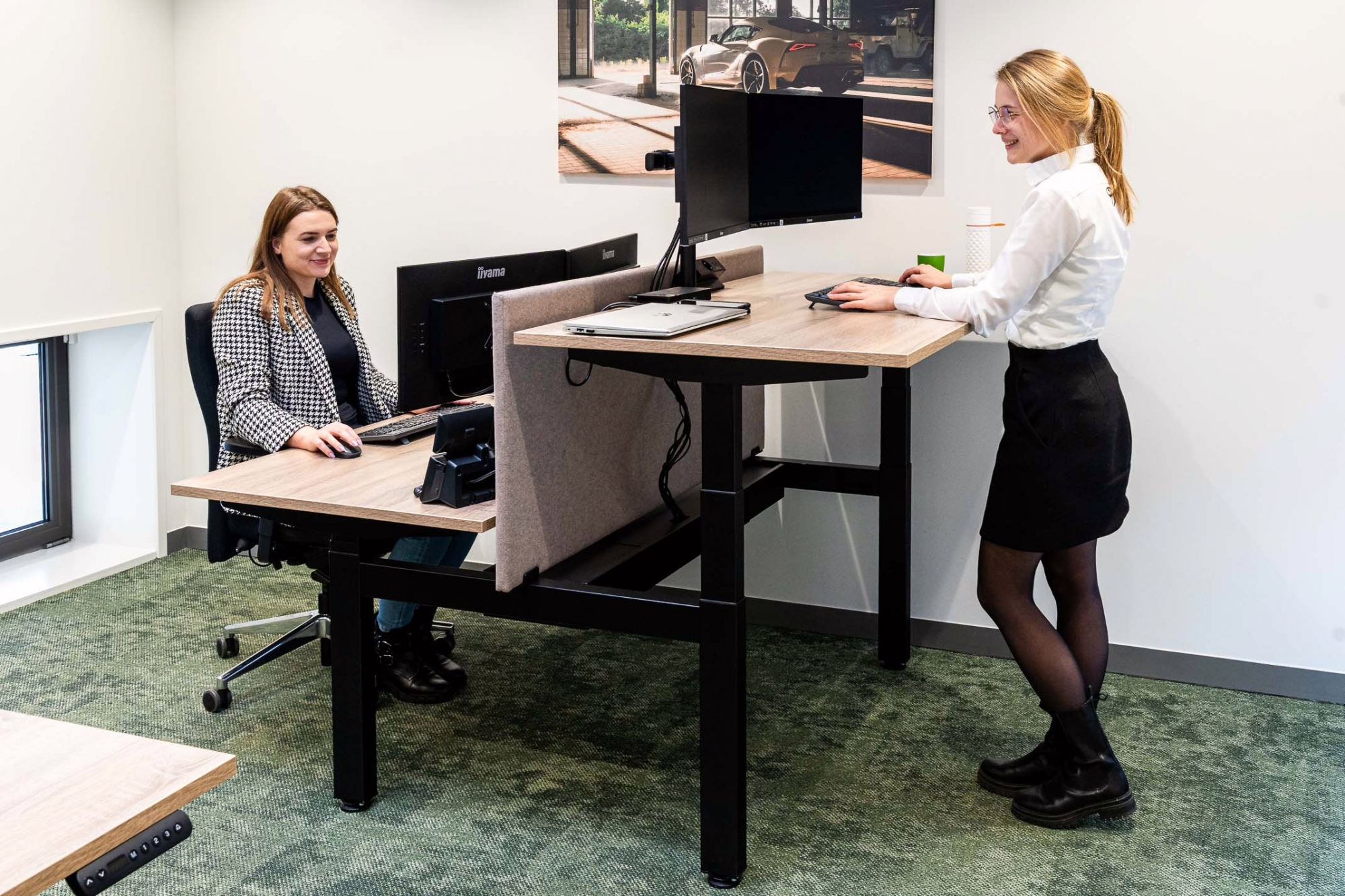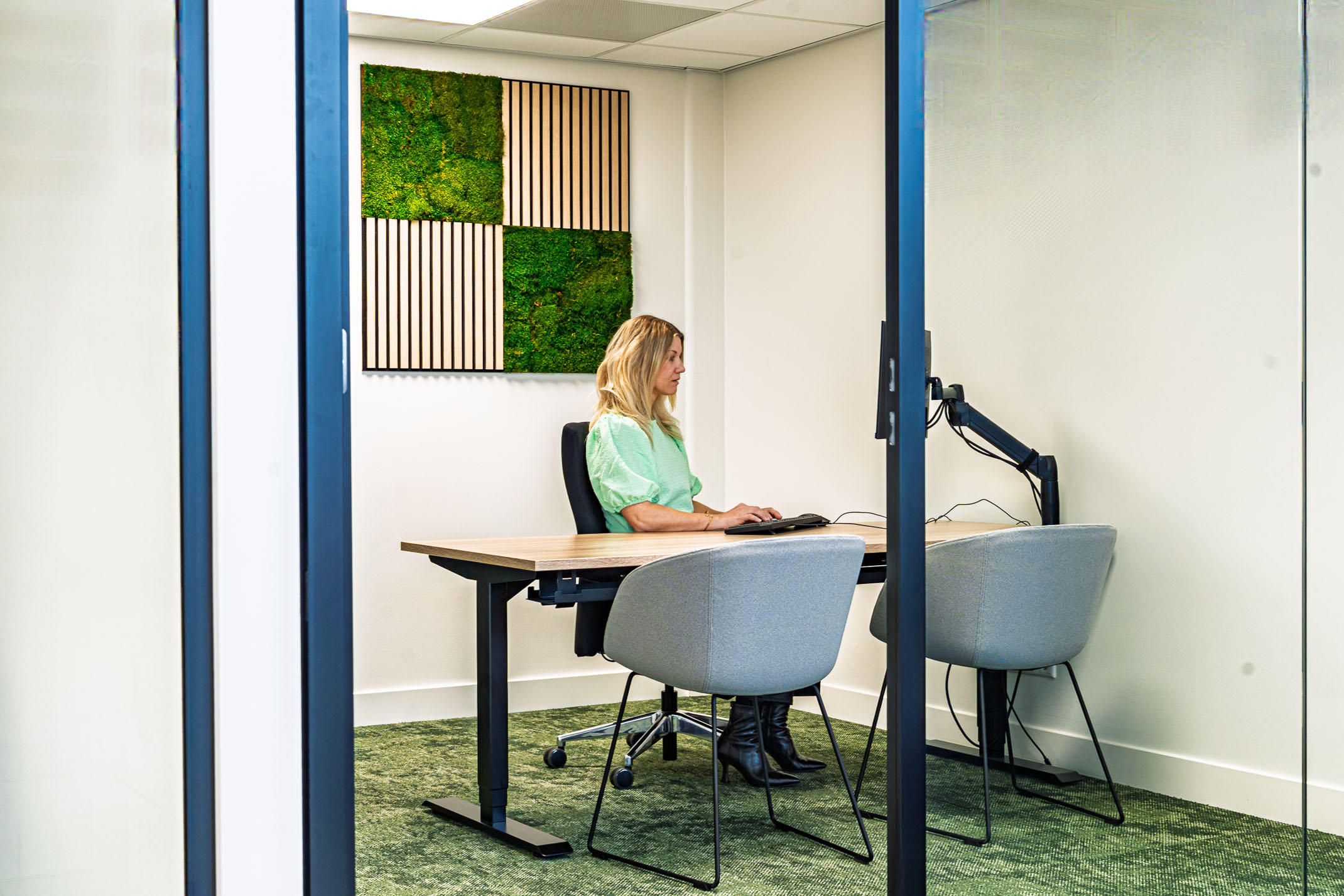 Ergonomische zit-sta werkplekken met akoestische oplossingen en ergonomische bureaustoelen.