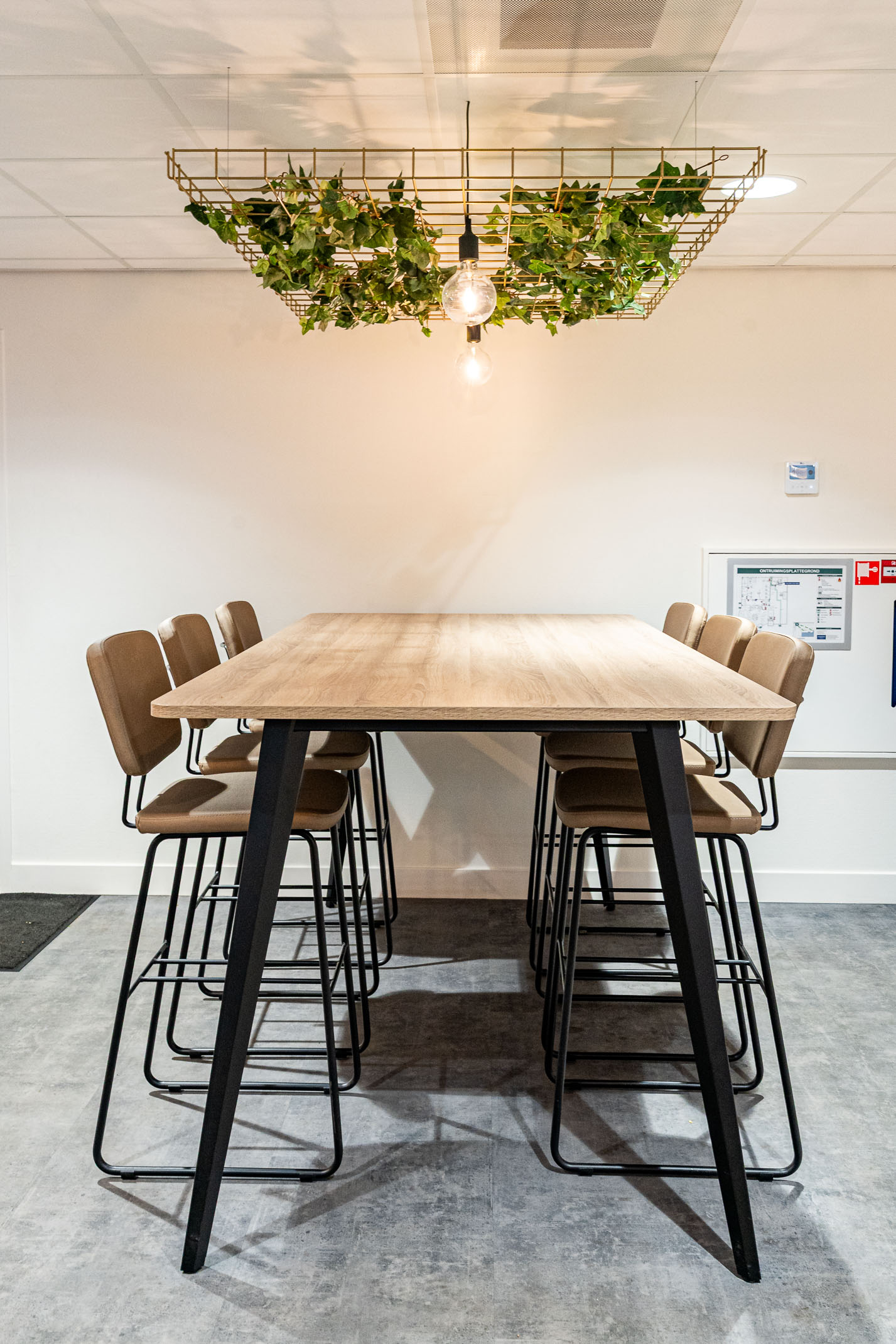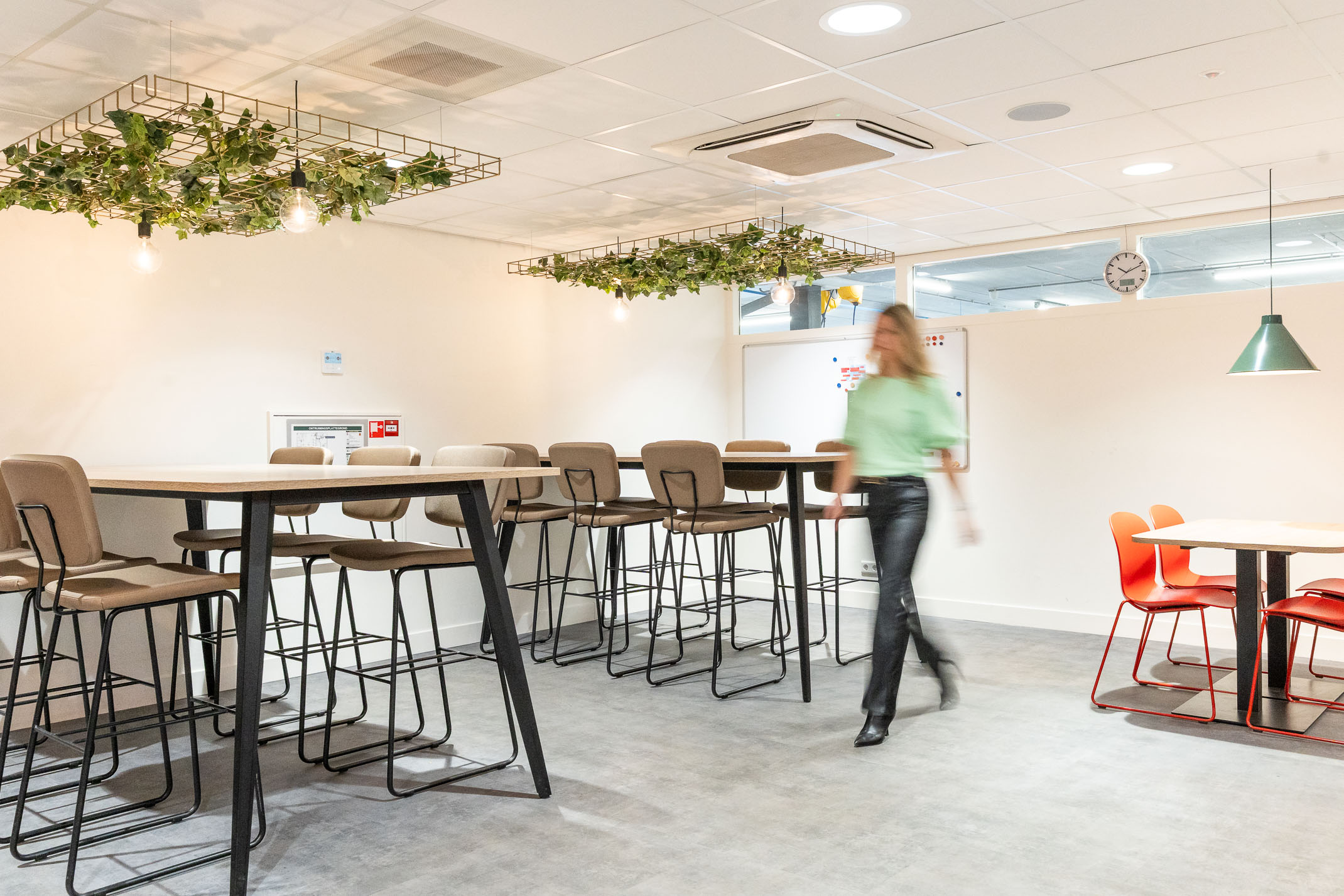 In de nieuwe bedrijfskantine, kunnen de medewerkers comfortabel hoog en laag zitten. Met groen aan het plafond is het geheel extra sfeervol.