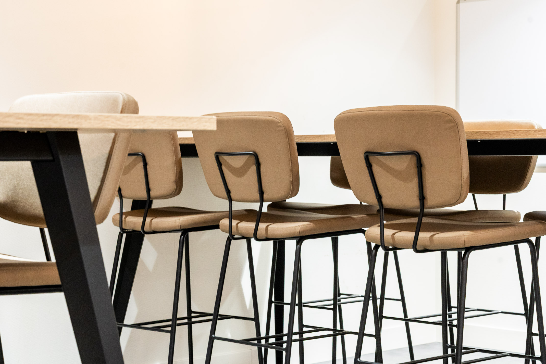 Voor de hoge tafel hebben we de Forza barkruk van Huislijn ingezet. Een elegante en comfortabele barkruk met een stoere uitstraling. We hebben ze voorzien van een afneembare stof, wat zeer praktisch is in een kantine waar ook monteurs gebruik van maken.