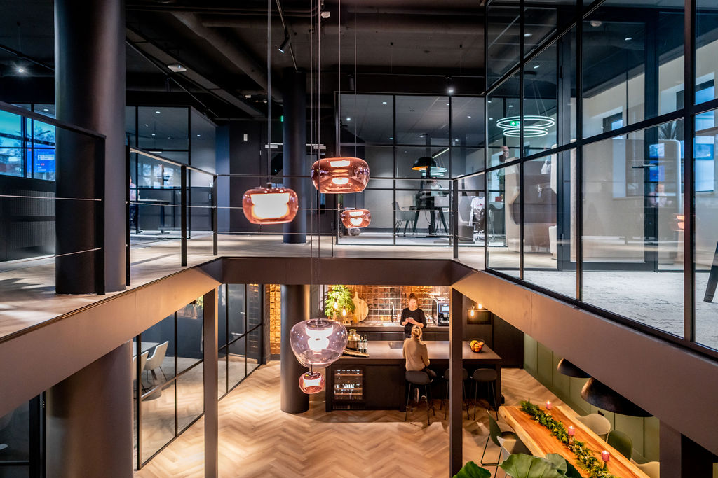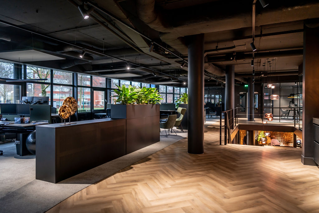 In het nieuwe kantoor ontmoeten industrie en warmte elkaar: zwarte plafonds, sfeervolle verlichting en robuuste, zachte Fenix-werkbladen creëren een moderne, comfortabele werkomgeving.