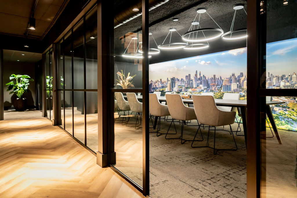 Het kantoor is open en licht, met plek voor overleg, één-op-één gesprekken in akoestische zitbanken of brainstorms aan de hoge bartafel. Het souterrain biedt een multifunctionele ruimte: vergaderingen met uitzicht op de skyline van Bangkok, ontspanning of een gezellige borrel in de keuken.